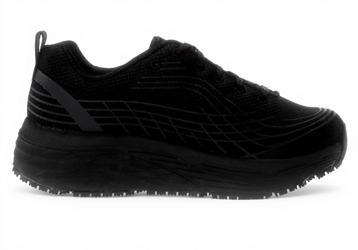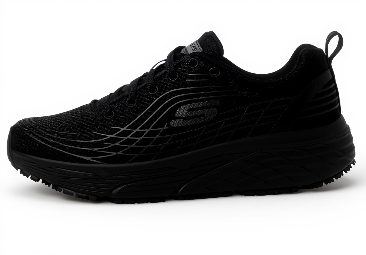 La suola Max Cushioning Elite offre un’ammortizzazione progressiva, percepibile soprattutto su superfici rigide. Il memory foam raffreddato ad aria avvolge il piede con una morbidezza che non comprime eccessivamente, mentre la tomaia in tessuto nero, sobria e resistente, si adatta senza costrizioni. Noterai come il design antiscivolo garantisce aderenza su pavimenti lisci, con una trazione che evita scivolamenti improvvisi.